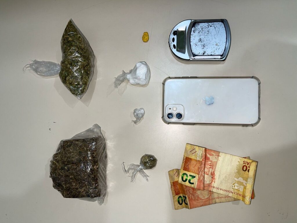 Durante a busca pessoal, foi encontrado dentro do forro do seu capacete, 01 trouxinha de maconha, 01 trouxinha de cocaína e 01 comprimido de ecstasy. O indivíduo confirmou a prática do tráfico, informando que estaria naquele momento indo entregar as drogas a alguns usuários e que guardava mais das substâncias em sua residência, onde a sua genitora prontamente autorizou a entrada da guarnição, sendo que o próprio suspeito entregou para a guarnição 01 (uma) porção de maconha prensada pesando aproximadamente 185g; 01 porção de maconha in natura pesando aproximadamente 23g; 01 pedra de cocaína pesando aproximadamente 20g e 01 balança de precisão.