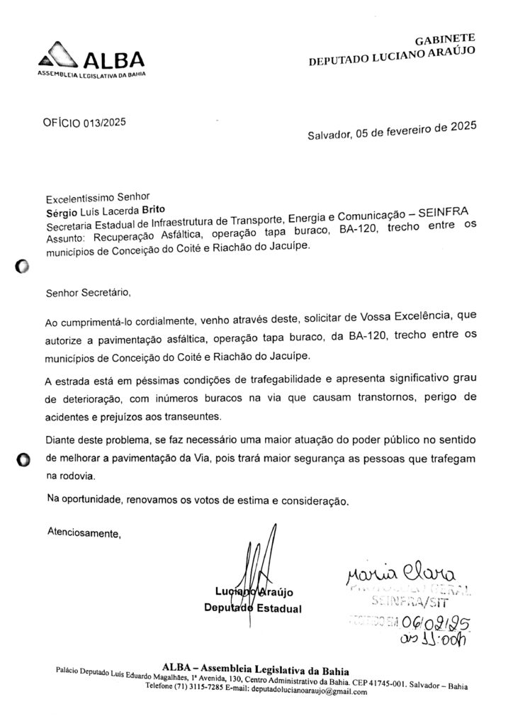 O deputado estadual Luciano Araújo afirmou que tem cobrado, desde o início do ano, melhorias para o trecho da BA-120 que liga os municípios de Riachão do Jacuípe e Conceição do Coité, no território do Sisal. A informação foi confirmada à nossa redação após questionamento sobre a atuação parlamentar em relação à situação crítica da rodovia.