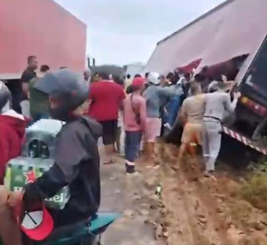 Carreta tomba e carga de cerveja é saqueada na BR 116 trecho Teofilândia a Araci