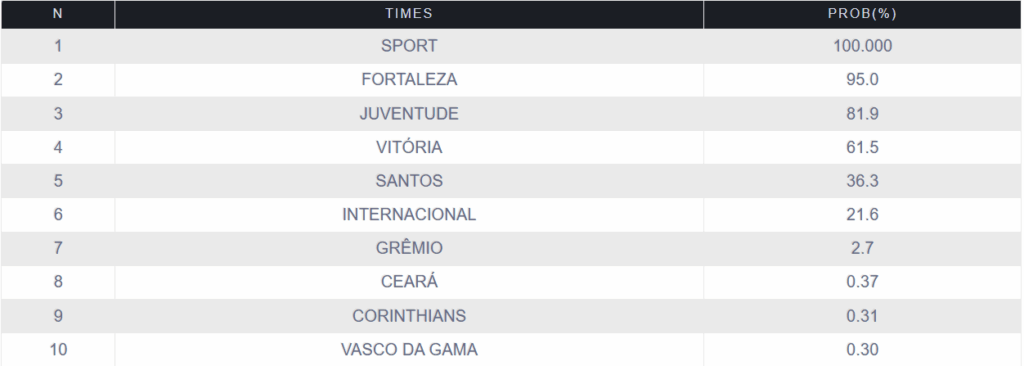 Depois disso, as probabilidades caem bastante, com o Grêmio somando 2,7%, seguido por Ceará, com 0,37%, Corinthians, com 0,31% e Vasco, com 0,30%.