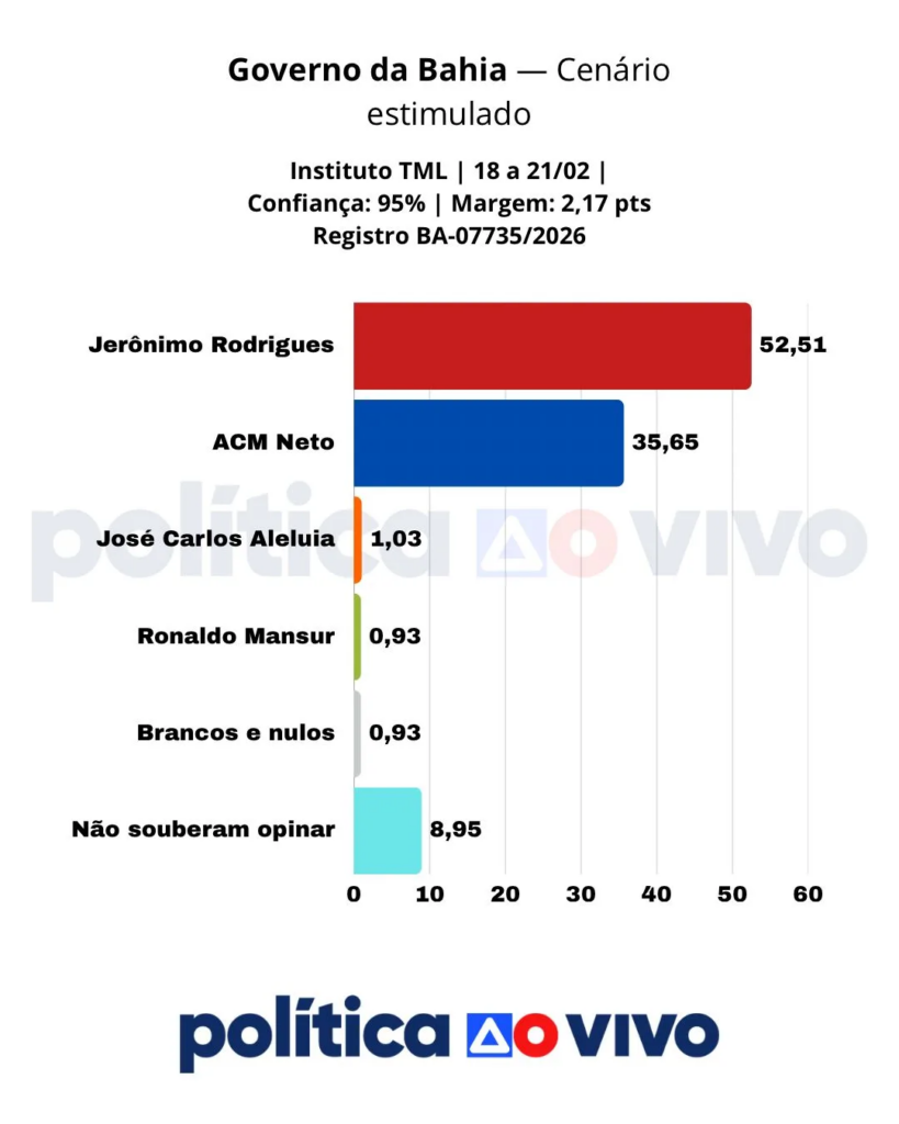 A pesquisa está registrada no Tribunal Regional Eleitoral da Bahia sob o número BA-07735/2026 e foi realizada entre os dias 18 e 21 de fevereiro. O levantamento tem nível de confiança de 95% e margem de erro estimada em aproximadamente 2,17 pontos percentuais, considerando técnica de amostragem aleatória simples. A estatística responsável é Hildete Alves da Costa.